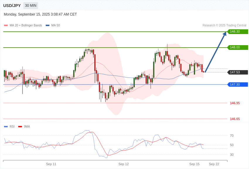 📈 Our preference: Long positions above 147.30 with targets at 148.00 & 148.30 in extension.