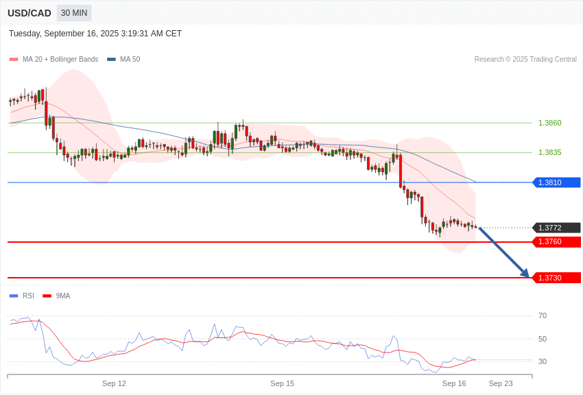📈 ការវិភាគបច្ចេកទេសតម្លៃគូរូបិយប័ណ្ណ CAD/USD អាចធ្លាក់ចុះចន្លោះពី 1.3810 – 1.3730