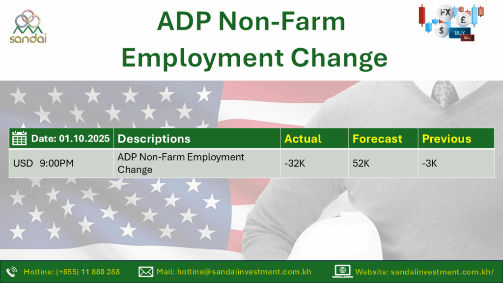 📅 របាយការណ៍ការផ្លាស់ប្ដូរការងារនៅអាមេរិក (មិនរាប់បញ្ចូលការងារកសិកម្ម) នៅថ្ងៃពុធ ទី១ ខែតុលា ឆ្នាំ២០២៥ បានបង្ហាញ់ថា មានការធ្លាក់ចុះ 32,000 នៅខែកញ្ញា ខុសពីការរំពឹងទុកថាអាចនឹងកើនឡើង 52,000 កន្លែង ដែលធ្វើអោយតម្លៃប្រាក់ឈ្នួលបុគ្គលិកប្រចាំឆ្នាំមានការកើនឡើង 4.5%។